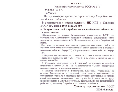 На падставе загаду начальніка ўпраўлення шкляной і хімічнай прамысловасці Беларускага Саўнаргаса № 174 выдадзены загад № 1 па Старобінскага калійнай камбінату. Абавязкі дырэктара СКК ускладзены на Цімафеева Алега Сяргеевіча. Дата 21 чэрвеня 1958 года лічыцца датай заснавання нашага прадпрыемства.