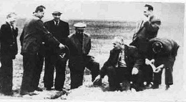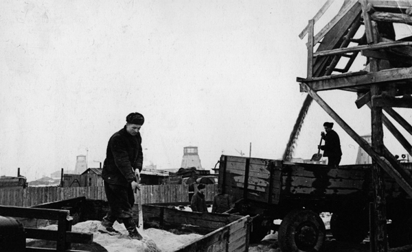 Геолаг О.П. Мох з першай калійнай соллю, здабытай на Чырвонаслабодскiм рудніку. Ускрыты & nbsp; & nbsp; другі калійны гарызонт на глыбіні & nbsp; & nbsp; - 472 метра.
