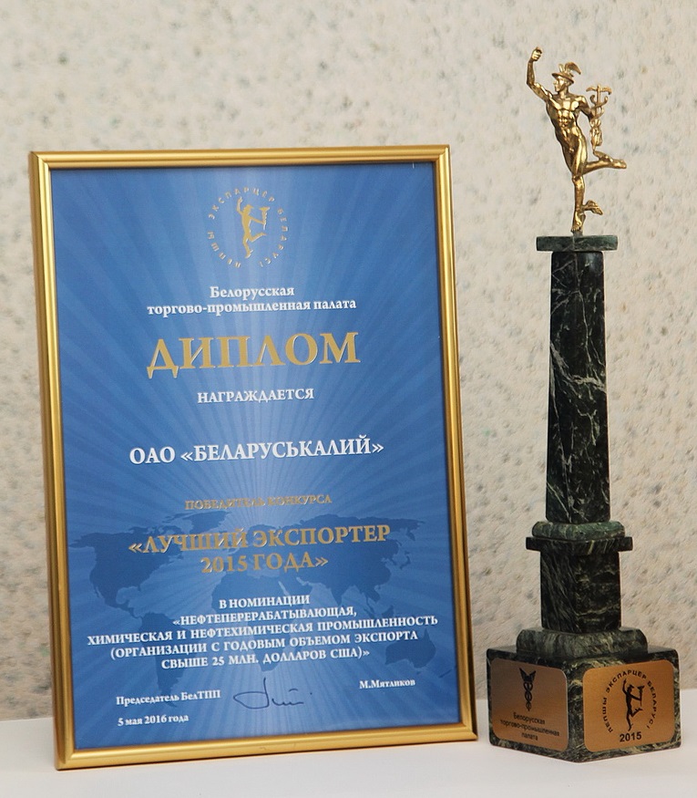 У мае 2017 года Гандлёва-прамысловай палатай Рэспублікі Беларусь падведзены вынікі конкурсу «Лепшы экспарцёр 2016 года". У намінацыі "Нафтаперапрацоўчая, хімічная і нафтахімічная прамысловасць (арганізацыі з гадавым аб'ёмам экспарту звыш 25 млн. Даляраў ЗША) пераможцамі конкурсу прызнаны ААТ« Беларуськалій »і ААТ« Беларуская калійная кампанія ». За апошняе дзесяцігоддзе ААТ" Беларуськалій "неаднаразова перамагала конкурсу« Лепшы экспарцёр года ».